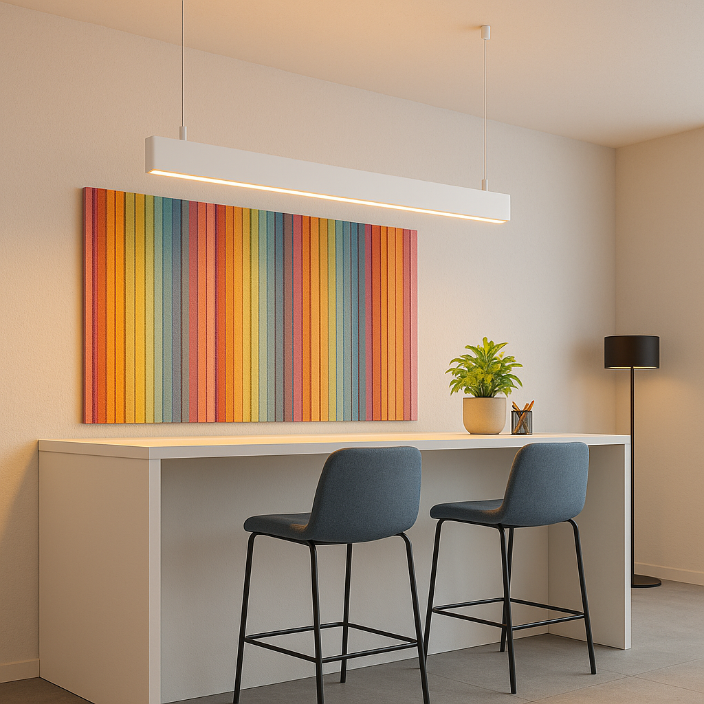 Barra colgante de aluminio blanco, con iluminación directa e indirecta, ideal para utilizar en cualquier espacio de trabajo. Su simple forma y diseño, otorgan al ambiente una iluminación moderna, junto al mejor estilo nórdico.