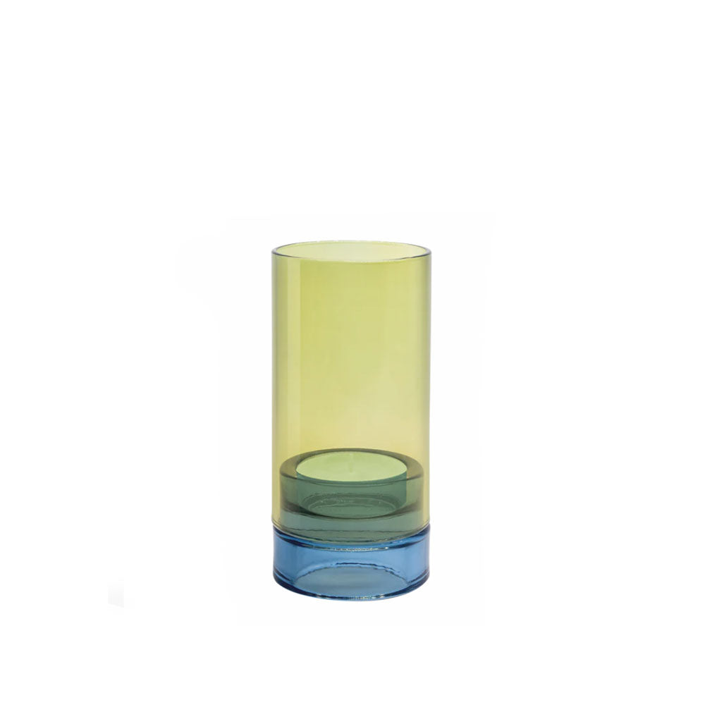 Candelabro de vidrio con bloques de color, soplado a mano. La vela se puede colocar dentro del cilindro o, si se le da la vuelta, encima de la base.