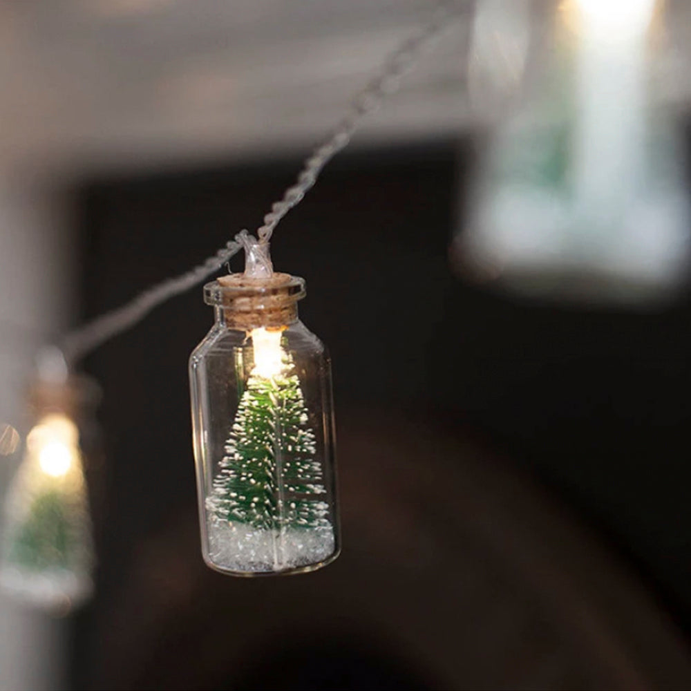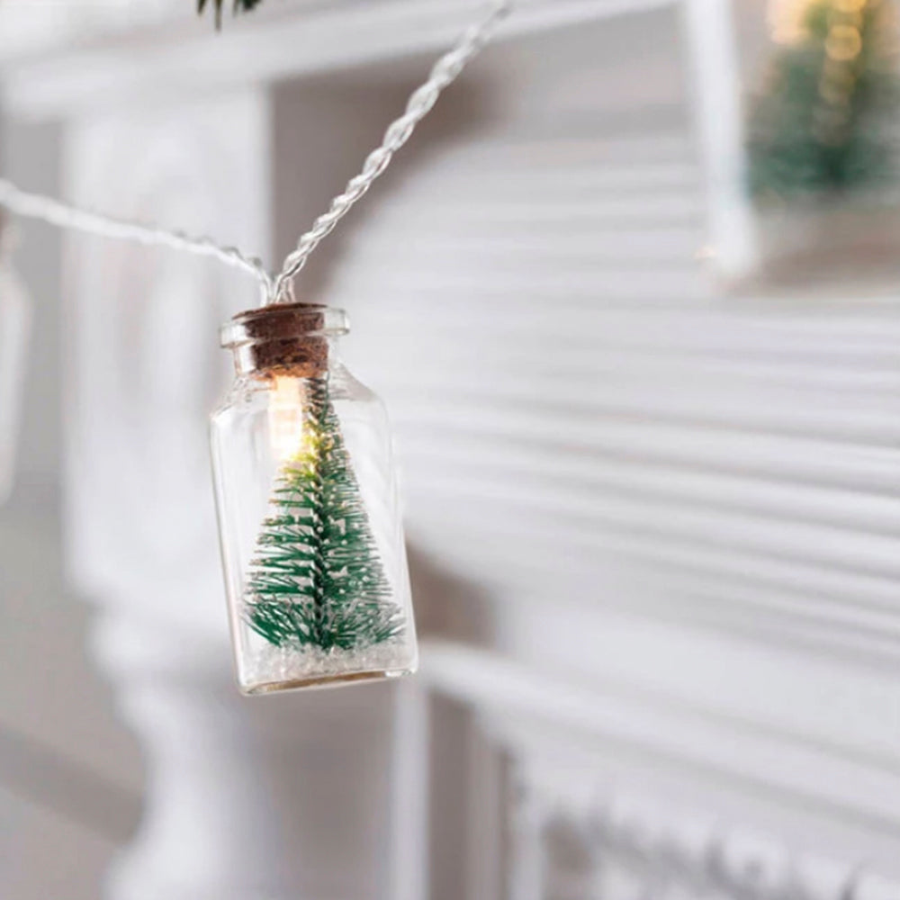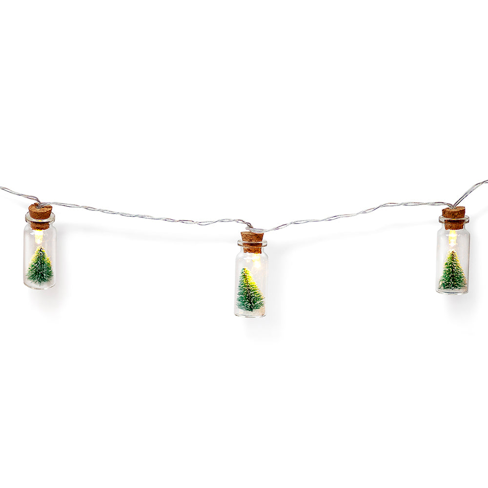 La Guirnalda de Luces Led Pino mide 3 metros y es apta tanto para usarla en espacios interiores como exteriores. Cable de plástico que incluye 20 luces led al interior de pequeños frascos de vidrio. Color de emisión blanco cálido. Utiliza 3 pilas AA (no incluídas).
