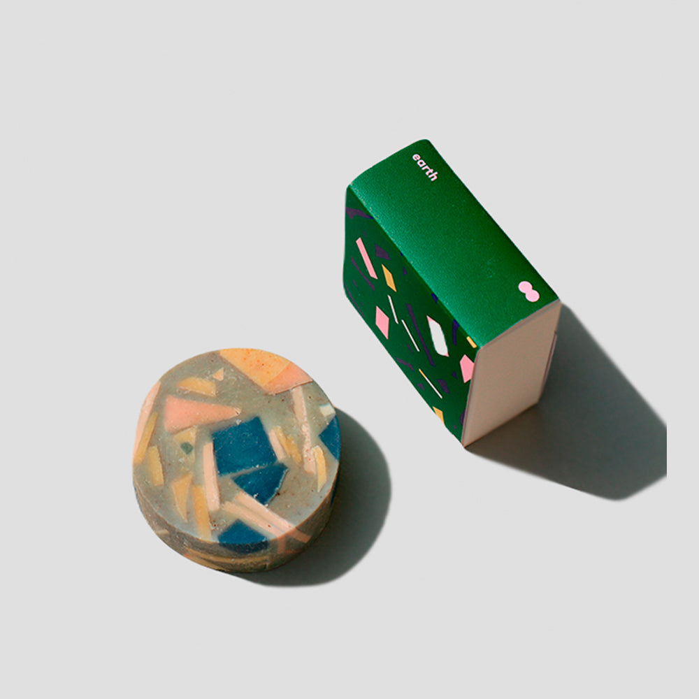 Surface, está inspirado en la reutilización de materiales desechados en un entorno industrial. Cada jabón, representa un pequeño universo que se asemeja a un planeta y su naturaleza. Enriquecidos con aceite de oliva de alta calidad e ingredientes naturales, estos jabones brindan calma y suavidad.