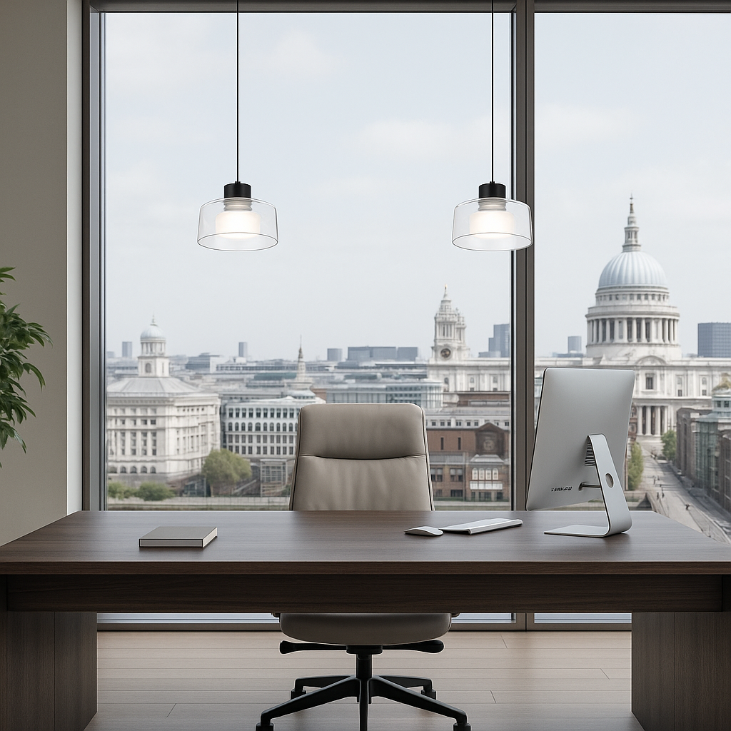 Lámpara colgante de aluminio negro y vidrio transparente, que gracias a su forma y diseño, entrega una iluminación simple y moderna.