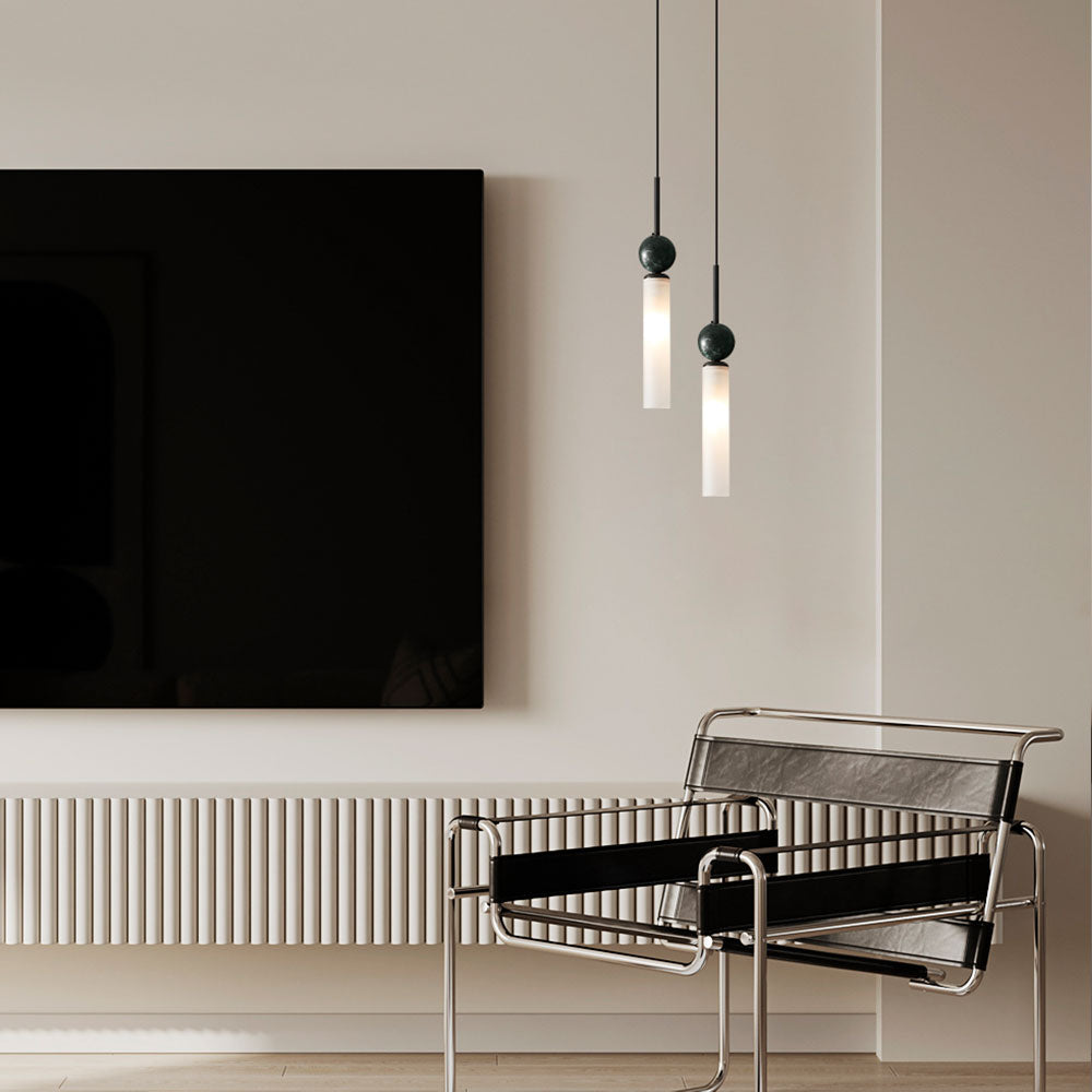 Lámpara colgante de vidrio opal con accesorio en mármol, que gracias a su forma y diseño, entrega una iluminación simple y moderna.