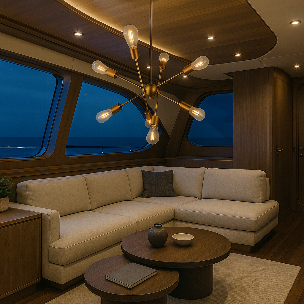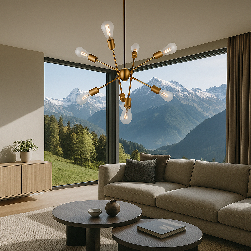 Lámpara chandelier color dorado 8 esferas. Elegante y moderna, entrega calidez y diseño a cada espacio.
