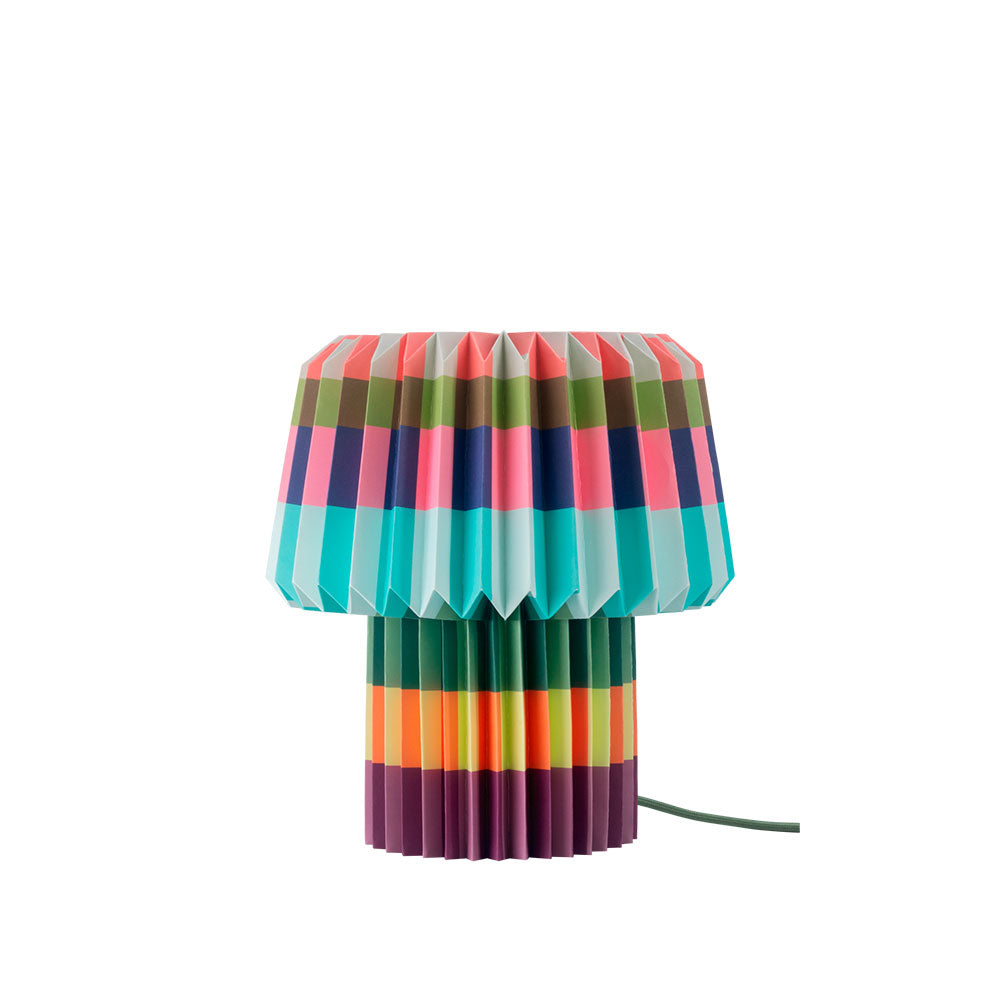 Lámpara de papel plisado, que no pasa desapercibida gracias a su diseño, materialidad y colores.