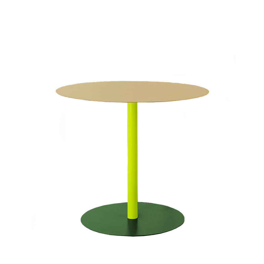 Mesa auxiliar redonda y minimalista, que destaca por su diseño y combinación de colores.