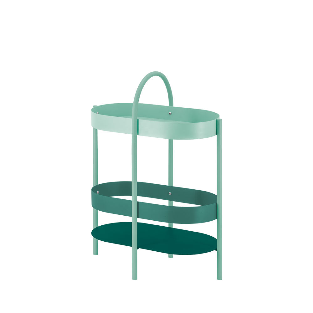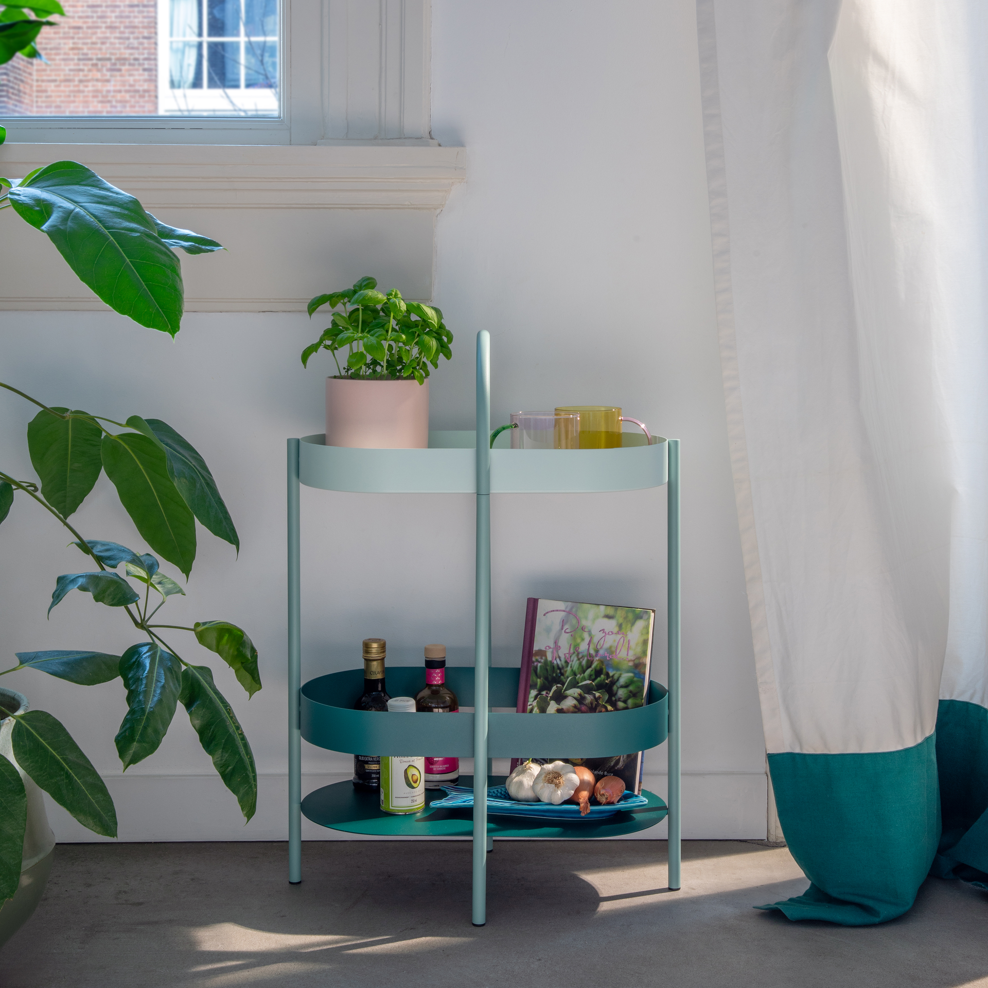 Mesa auxiliar, estantería, mueble bar: “Bárbara” se puede utilizar de forma multifuncional, gracias a sus dos niveles y práctica asa. Bebidas y snacks, de la cocina a la terraza; libros y lámparas, del living al dormitorio. Gracias a su diseño, “Bárbara” es fácil de trasladar.